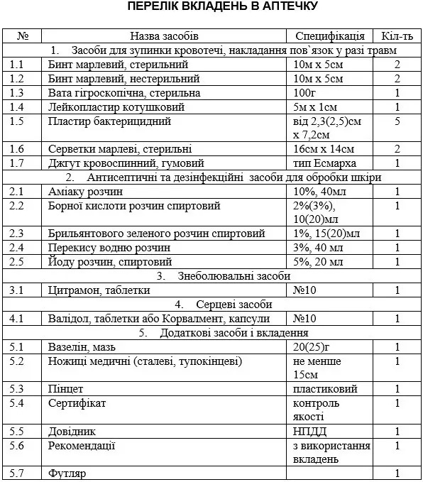 Аптечка содержит изделия для обработки и перевязки ран, антисептические, обезболивающие, сердечные и вспомогательные средства, а также справочник по оказанию первой помощи и рекомендации по применению вложений.