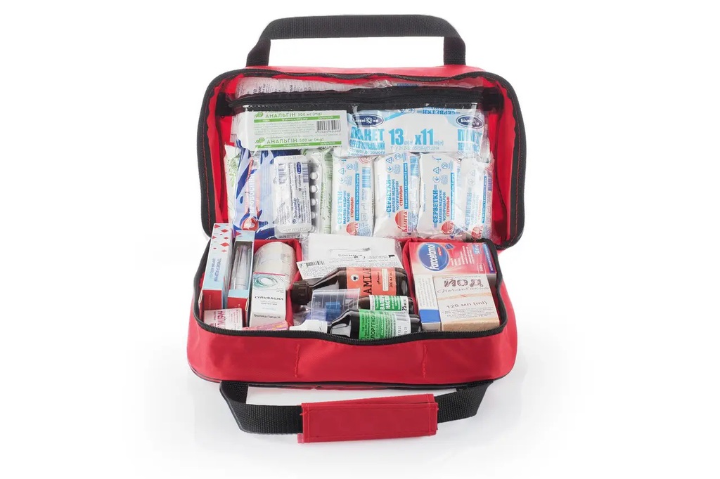 Аптечка содержит изделия для обработки и перевязки ран, сердечные, антисептические, жаропонижающие средства, средства при отравлениях, заболеваниях ротовой полости, вспомогательные средства, справочник по оказанию первой помощи и рекомендации по использованию вложений.