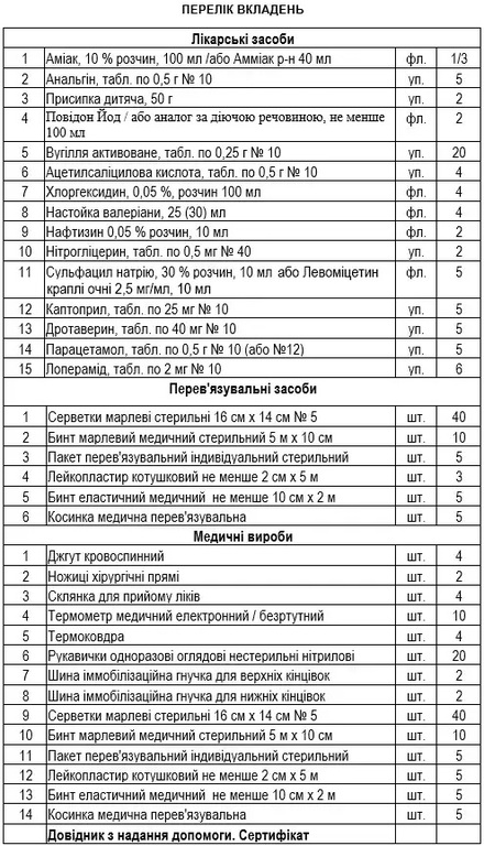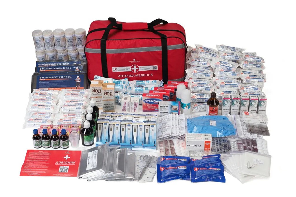 Аптечка содержит изделия для обработки и перевязки ран, сердечные, антисептические, жаропонижающие средства, средства при отравлениях, заболеваниях ротовой полости, вспомогательные средства, справочник по оказанию первой помощи и рекомендации по использованию вложений.