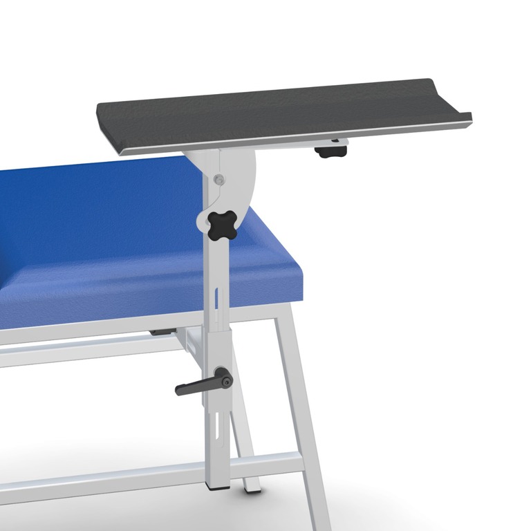 К стулу прикреплен подлокотник, который также имеет бесшовную обивку медицинским кожзаменителем. Стул установлен на четыре резиновые опоры.